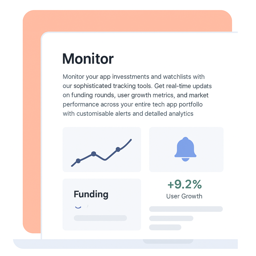 Monitor your app investments and watchlists with our sophisticated tracking tools. Get real-time updates on funding rounds, user growth metrics, and market performance across your entire tech app portfolio with customisable alerts and detailed analytics.